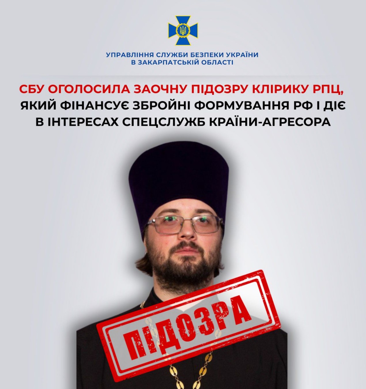 За матеріалами СБУ заочний тюремний вирок отримав клірик рпц, який «благословляв» убивства українців та фінансував окупантів